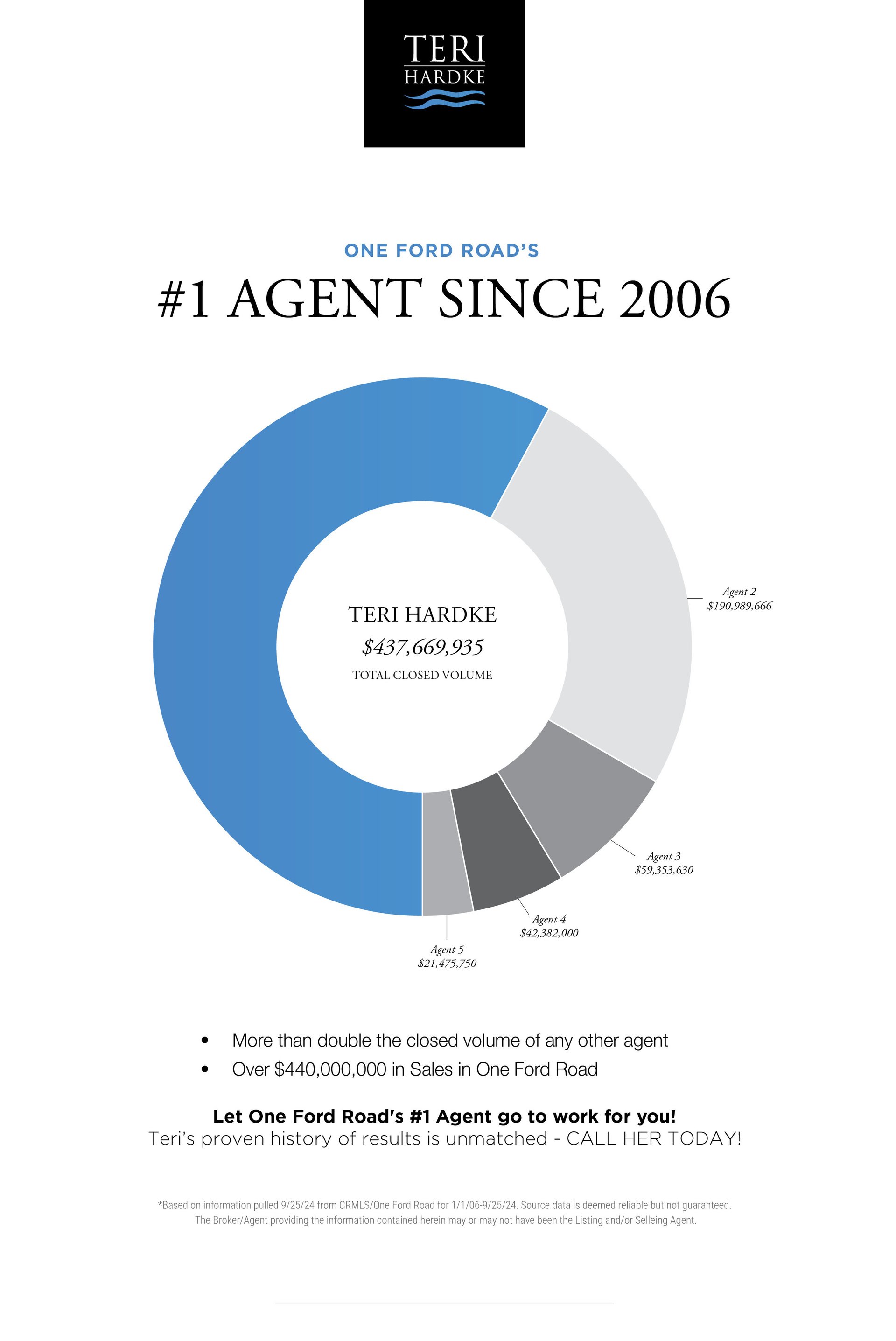 Teri Hardke has been a proud resident of One Ford Road for the past twenty five years, and is equally proud to represent the largest market share of homes sold in the community.